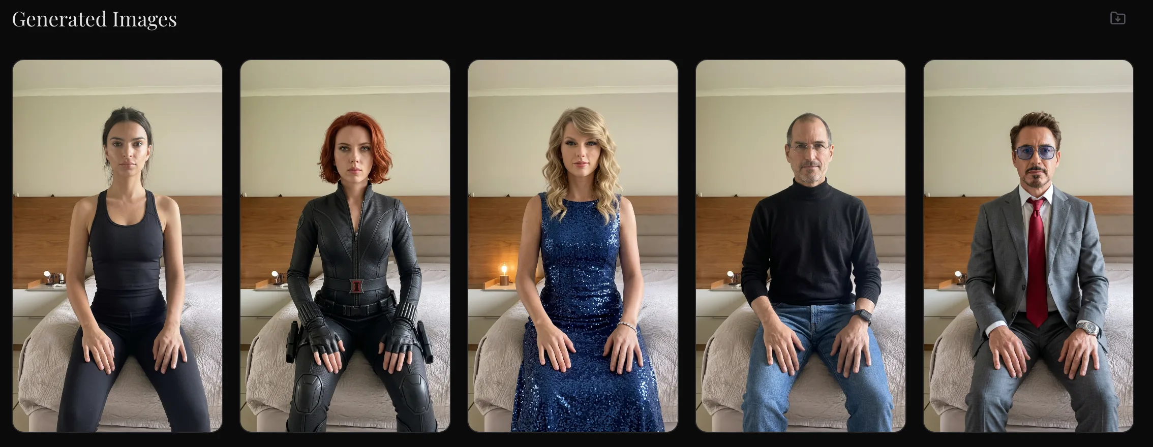 The dashboard also has an outfit field per row. Each celebrity gets their signature look. Tony Stark gets the suit. Steve Jobs gets the turtleneck. Each row = one generation. You can add as many as you want — the API handles them all.